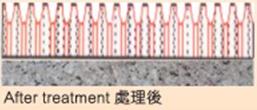 经防滑处理的地面砖或地面石质材料放大数倍后,毛细通道宽,毛细孔上层形成坑凹,使摩擦系数大大增加,遇水产生物理吸盘作用,形成肉眼无法识别的小圆孔摩擦系数增加到0.8-0.9。
